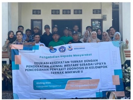 Kegiatan yang dipimpin drh. Vindo Rossy Pertiwi, M.Si., bersama Prof. Dr. Nurhayati, S.Pt., M.P., Gusma Gama Maradon, S.Pt., M.Si., Desi Maria Sinaga, S.Pt., M.Si., Melia Afnida Santi, S.Pt., M.Si., dan Dr. Ir. Heni Suryani, S.Pt., IPM, mengusung tema “Edukasi Kesehatan Ternak dengan Pendekatan Animal Welfare Sebagai Upaya Pencegahan Penyakit Zoonosis di Kelompok Ternak Makmur II”.