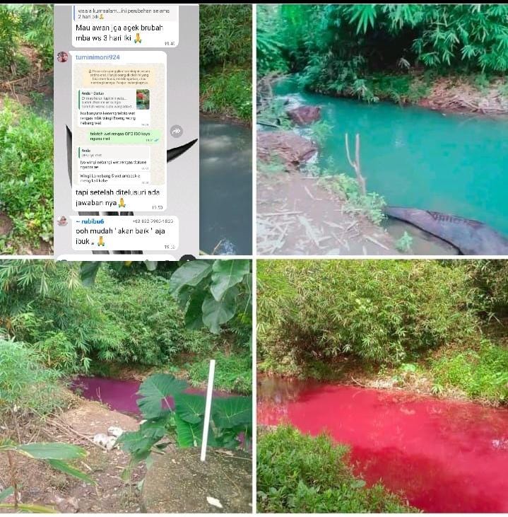 Di sisi lain, tangkapan layar WhatsApp dari tuminimoni924 yang dikirimkan di grup ibu-ibu Pekon Banjar Sari, menyebutkan bahwa warna merah dan hijau kemungkinan besar disebabkan oleh getah kayu rengas setelah penebangan pohon beberapa hari lalu. “Kemaren ada yang nebang kayu rengas, getahnya ngocor aja. Lima pohon rengas yang ditebang, semua batangnya roboh di sungai,” ujarnya.