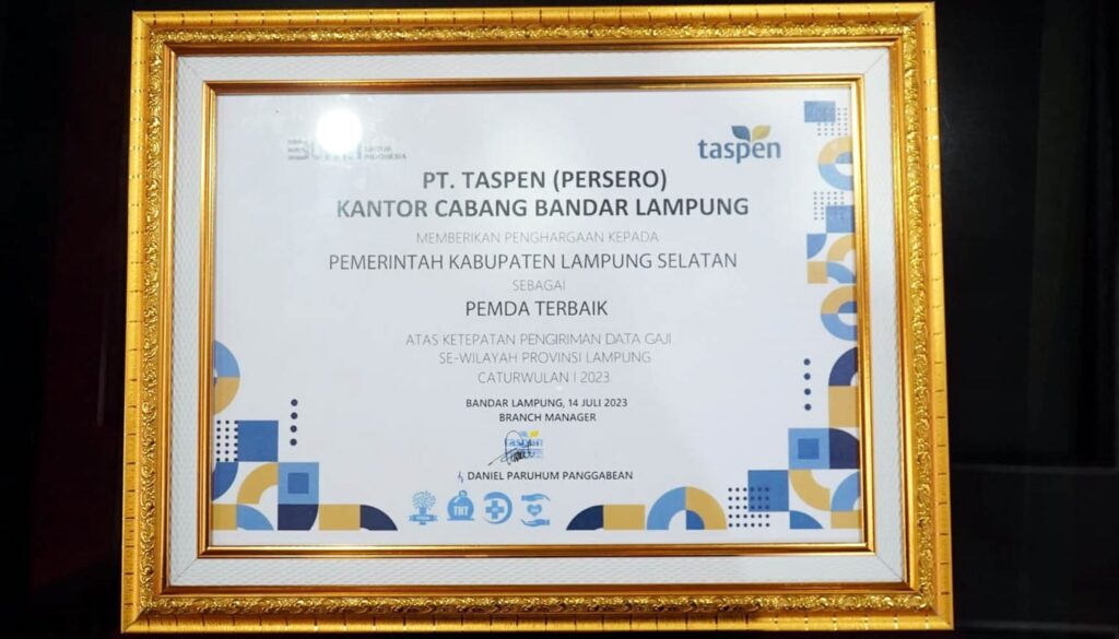 Pemkab Lampung Selatan Raih Penghargaan Kategori Ketepatan Pengiriman Data Gaji